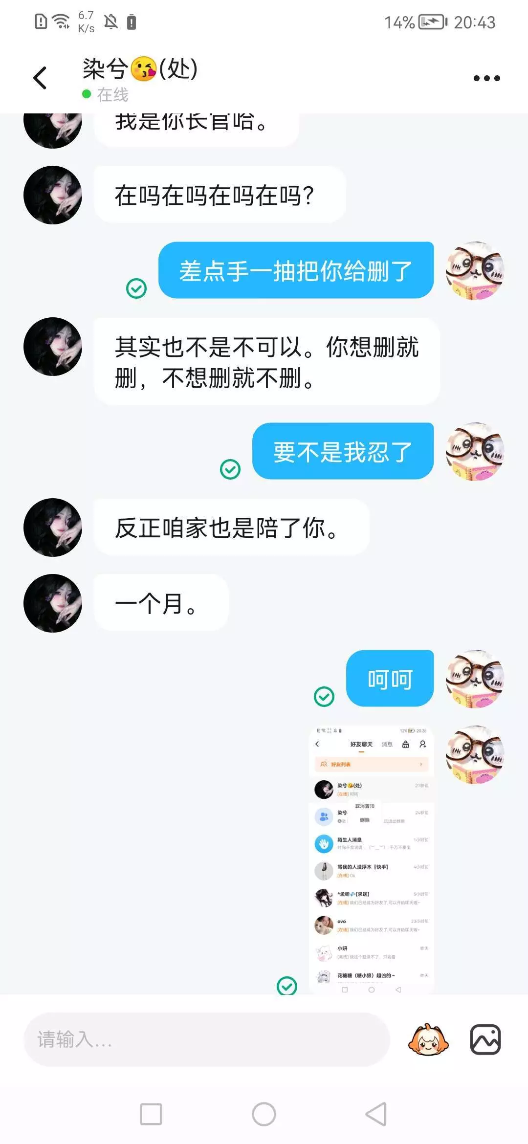 好友真的疯了,我刚发了一个帖,里面有人评论,说刚刚刷我,我一看结果是那好友在发我说的那个话,我说他寒了我的心,他又删了,来看看是我疯了还是他疯了