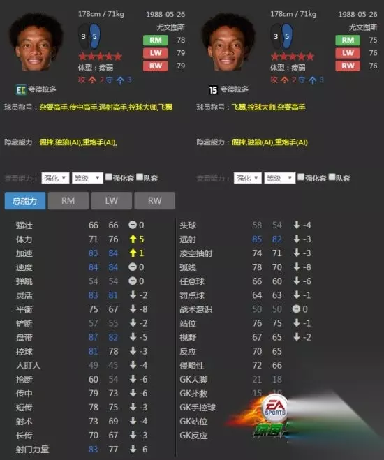 胡安·夸德拉多是哥伦比亚阵中唯数不多的主打边路的球员之一(J罗都去打前腰和前锋了)。16EC卡对他的增长并不是很多。只是在控球和传球方面有所提升。但考虑到哥伦比亚阵中主打右边前卫的球员并不是很多。他坐镇主力边前卫的位置是无可厚非的。 16ECJ罗