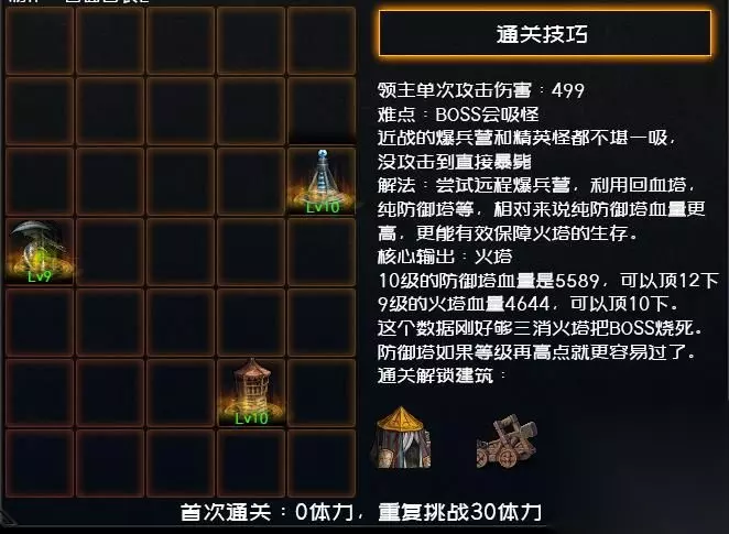 首次通关:0体力,重复挑战30体力 通关技巧: 领主单次攻击伤害:499 难点:BOSS会吸怪 近战的爆兵营和精英怪都不堪一吸,没攻击到直接暴毙 解法:尝试远程爆兵营,利用回血塔,纯防御塔等,相对来说纯防御塔血量更高,更能有效保障火塔的生存。 核心输出:火塔 10级的防御塔血量是5589,可以顶12下 9级的火塔血量4644,可以顶10下。 这个数据刚好够三消火塔把BOSS烧死。防御塔如果等级再高点就更容易过了。 以上就是小编为大家带来的创世之书4-4的通关攻略了,按照小编为大家带来的攻略来打的话,还是很容易打过的。 DNF2020活动 欲望之塔