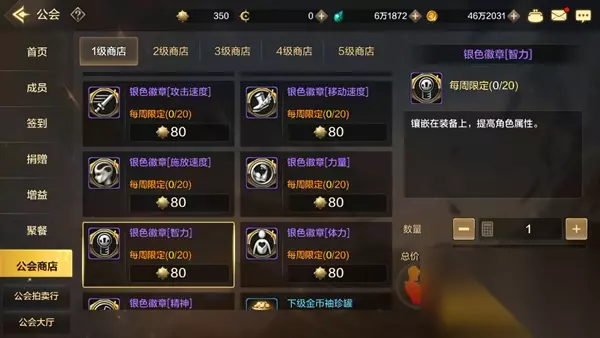 3、公会商店 通过【公会】-【公会商店】购买。消耗贡献币就可以购买每周限定的银色徽章。 贡献币每周可获得的量比较少,可以根据自己的需求购买。