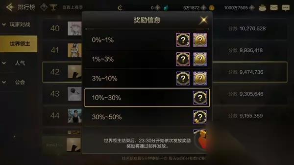 4、世界领主 通过每日世界领主排名领取,排名达到30%以前就可以获得完整的银色徽章,30%以后就只有银色徽章碎片。组抗魔值、武器强化高的小伙伴更容易获得高排名高奖励。