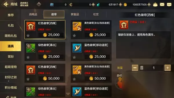 徽章在DNF一直是一个非常重要的提升方式。当然,这一点在DNF手游中也不例外。然而手游将徽章系统进行了改版,这就导致许多玩家初次解锁徽章之后会一头雾水。那么DNF手游的徽章到底应该怎么使用才能达到最大提升呢?本期攻略,就让我们一起来看看吧。 一、获取途径 1、商城购买 在【商城】-【道具】界面可以消耗金币购买。每个角色限制购买数量,消耗的也只是金币,还是挺划算的。前期建议购买红色四维、绿色暴击。