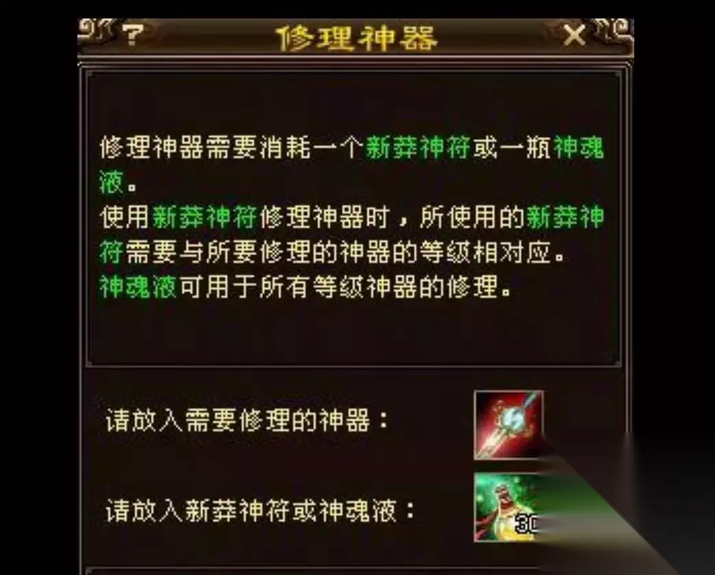 像42级的神器在进行修理时需要用到一张一级新莽神符,当然也可以用一瓶神源液进行修理。神源液可以在元宝商店购买,也可以在帮会百宝阁中购买。