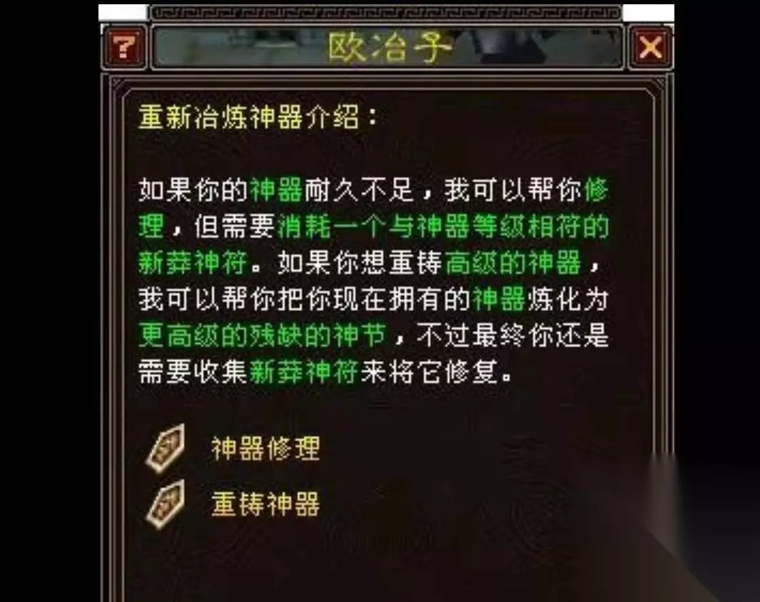 神器以外的所有手工装备,包括门派套装以及别的职业套装都有三次可修理次数。如果修理次数为零的时候,修理装备如何失败的话,所修理的装备及装备上的宝石,强化以及镶嵌的雕纹都会随同装备一同消失。所以装备多要定期及时修理,不要等到装备持久度为零再去修理。因为持久度为零进行装备修理,修理失败之后装备的可修理次数就会减少一次。如果装备可修理次数为零,可以通过使用润物露来增加装备的可修理次数。 神器修理和一般的手工装备略有不同。首先神器是不存在可修理次数的。也就是说神器修理是百分之一百成功。其次神器修理不止需要花费少量的金币,还需要用到适合神器等级的新莽神符。当然也可以用神源液代替,神源液是可以修理所有等级的神器。