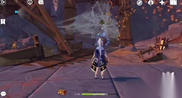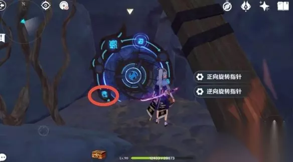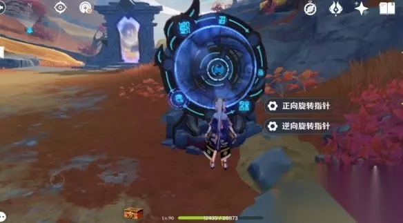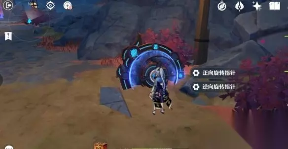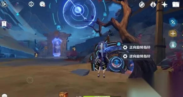 然后来到这个盘子跟前,两步操作,人物普攻先把这个字后面有棵小红树打了(省的等下再回来,如果发现不能打,就略过这一步,因为本人就一个号,测试不了第二次,我是回头过来找半天发现这个的)。 接着把盘子正向旋转指针,进那边的传送门,进来一段对话,接着清两个怪。