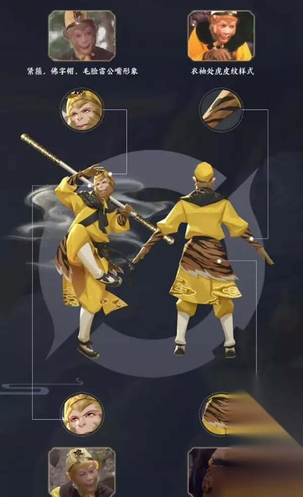 角色形象设计灵感 1、和86版西游记联动,因此在造型上面多结合孙行者的造型,对标志性的元素进行还原。 2、元素有帽子、紧箍、佛字帽、雷公脸和衣袖的虎皮样式,但是还增加了一些细节,皮肤效果也更加精致。 3、场景设计上也参考了部分的影视场景,比如花果山的设计、水帘洞洞天还有石碑等。