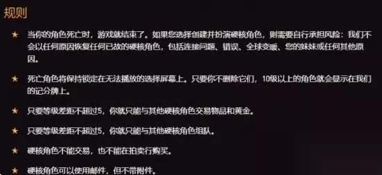 6、进入一命模式后,PVP功能将被自动关闭,除非你自己开启或者处于战争模式下,背包中除了炉石之外的所有物品都将消失,你将无法与非一命模式的人组队,差5级的人也无法与你组队。 7、一命模式在达到60级后完成,如果你在60级前死亡,可以复活,并获得特殊奖励,可以在55级时找到NPC进入永久一命模式,这意味着即使达到60级,死亡后也将无法复活。