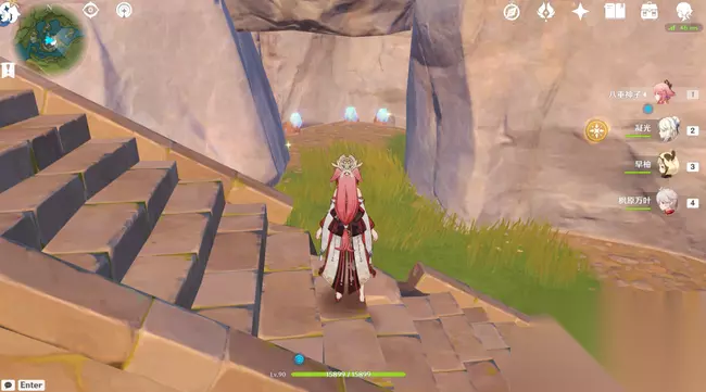 6.在5处往南方向冲刺,经过岩盾丘丘人到达矿洞入口,讨债人守着2个水晶矿(魔晶矿刷新时会多出2个水晶矿、3个魔晶矿)