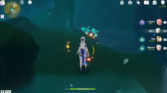 8.出矿洞沿着小河走,右拐经过三个挖东西丘丘人,向北走进入新的矿洞滑翔下去,地灵龛左手边1个水晶矿,再往东南方向转视角,渡过水域又2个水晶矿(魔晶矿刷新时会多出2个水晶矿、2个魔晶矿)