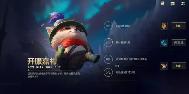 二、活动介绍 1、开服嘉礼相当于游戏当中的一个回馈活动,可以看到每个任务的达成都很简单,对局挑战或者累计登陆这种; 2、前往达成指定的任务即可获取到的奖励内容包含:改名卡,魄罗能量、试用卡以及全英雄畅玩卡等; 3、期间包括了三项活动任务,完成对局挑战,累计登陆四天,组队完成对局,没有挑战性的任务; 4、所以还是很值得大家参与的,获取的改名卡可以用来修改昵称,商城内暂未上线的道具可以先入手一波。