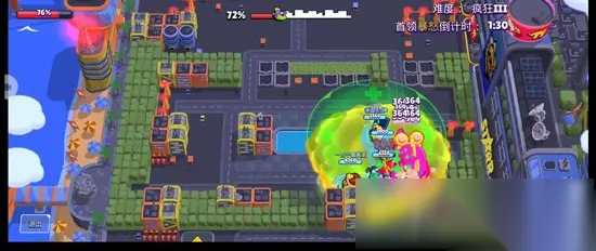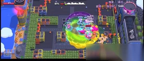8比特高伤害,同时超级技能伤害放大器不仅能加强团队的攻击输出。同时也能抵挡伤害、吸引仇恨。 如果有星徽的话,建议带复活币。由于怪兽一直在运动,所以没有办法在固定的点位进行攻击。而复活币能提高8比特和整个团队的容错率,即使不小心阵亡也能马上复活。 【其他英雄推荐:】 柯尔特: 有妙具的柯尔特输出能力还是很强的,但是柯尔特释放超级技能时一定要注意,可能怪兽没有把建筑打掉,而你放个大招把建筑打掉了。 【心得分享】 这个模式从普通到疯狂,主要还是比较吃等级。如果等级不够,可以拿技巧来凑。疯狂之后就既吃等级又吃技巧。 最主要的一定要打乱怪兽的摧毁机制,最好能够让怪兽七零八落地摧毁。每个地方都被摧毁的剩一到两个建筑。那么怪兽就需要不断转场,这是可行的,并不是纸上谈兵,只是很吃技巧和队友的配合。 后期倒计时结束,怪兽会暴怒。暴怒状态下的怪兽体积会变大,同时移动速度也会明显减缓。这个时候,怪兽虽然凶猛,但也是一个抢输出的好时机。轮流扛伤,拉仇恨,积极放置衍生物。