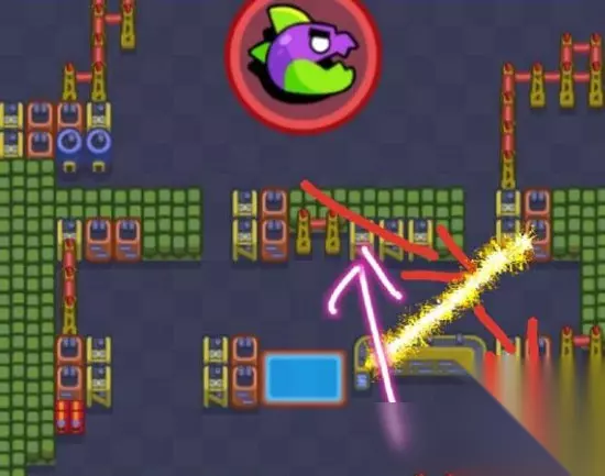 前期怪兽的攻击方向是固定的,顺着图中红色箭头向右下攻击摧毁建筑,这个过程中怪兽对玩家没有伤害,可以任意攻击怪兽。 在后期的难度下,能有效的干扰走位,对胜负极为关键。一定不能顺着怪兽的运动趋势来进行被动的防御。 之所以选择上文中提到的英雄。首先小蜜蜂无限弹药,相比于其他英雄,输出很持续,并且伤害也很足。同时,小蜜蜂的蜂巢对怪兽具有一定的减速效果。 前期在怪兽的移动中防止怪兽继续向下攻击建筑,所以在黄线位置放置蜜蜂的蜂巢。由于前期怪兽不会攻击,所以蜂巢可以持续在场,这样可以有效的减少怪兽向下运动的速度。卡时间输出,最主要的作用是防止怪兽进一步破坏。 之后帕姆的回血柱放在怪兽的身后,因为怪兽在一定时间后就会愤怒,进入狂暴模式,那么之后的攻击对象就变成了玩家。只有在攻击状态下的怪兽才有仇恨机制,才会被我们玩家吸引。所以一定要趁这个时候将怪兽往上牵引,将回血柱放在怪兽身后也是为了吸引怪兽的伤害,然后帕姆配合着牵引。 格尔超级技能之后将怪兽往上吹,能够进一步阻止怪兽向下。建议在怪兽狂暴状态时将怪兽吸引到右上角,因为那个地方没有建筑,同时接下来怪兽的走位应该会是顺势向下,无论是向下还是向左怪兽都会绕一个大圈才能摧毁所有的建筑。 由于怪兽体积较大,所以格尔的六发雪球能够全部命中,满级格尔单次攻击伤害能有2600,输出能力十分强。 用阿渤的话,一定要有捕熊陷阱的星徽,算是一个比较高级的配置。一边充的一边攻击,快速的攒下超级技能,初期将地雷埋在怪兽移动的路径上,将怪兽定住,阻止怪兽进一步的破坏。