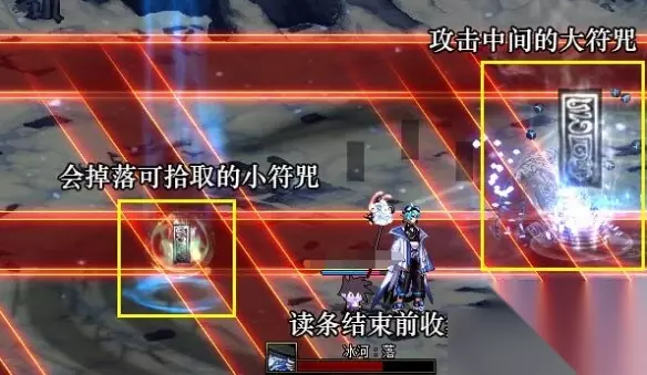核心机制:冰河·落 1、该技能在boss血量50%时候触发,触发后场地出现一些符咒攻击符咒掉落可拾取的小符咒; 2、读条结束前拾取小符咒*3即可进入无敌状态。