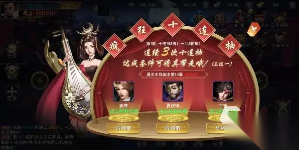 孙吴:周瑜、太史慈、孙策、鲁肃、大乔、主角 三国题材中,孙吴势力总会有着火属性的刻板印象,这套阵容便是火攻队。对灼烧目标有着攻击加成,方便接下来进行爆发伤害。 1号位的周瑜可让敌方全队产生灼烧debuff,太史慈与孙策对灼烧状态的敌人可进行超量输出。怒气方面大乔可以给全队回复怒气,提升出手施放技能的速度,鲁肃则能降低目标怒气,减少对方主力输出对我方的伤害。 此外太史慈+鲁肃,孙策+大乔能够激活合击特性,让输出能力继续爆表。 那么游戏中的武将有哪些渠道可以快速获得呢? 1.疯狂十连抽 通关主线副本第10章后,便可开启疯狂十连抽。能连续进行3次十连抽,从中带走一组武将,其中包含将为、夏侯惇、甘宁这样非常好用的武将,能够三选一将其带走。