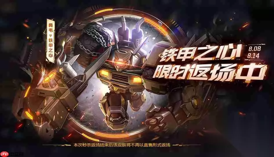 王者荣耀典韦铁甲之心皮肤即将限时返场,玩家仅需花费60点券即可入手。那么具体返场时间是什么时候呢?以下是详细信息,千万别错过! 典韦-铁甲之心限时秒杀返场详情 返场时间:8月8日0:00 至 8月14日23:59 获取价格:60点券 特别提醒:本次返场结束后,该皮肤将不再通过直售形式上线,错过将无法再次以相同方式获得。