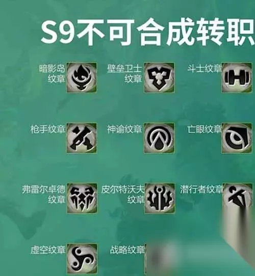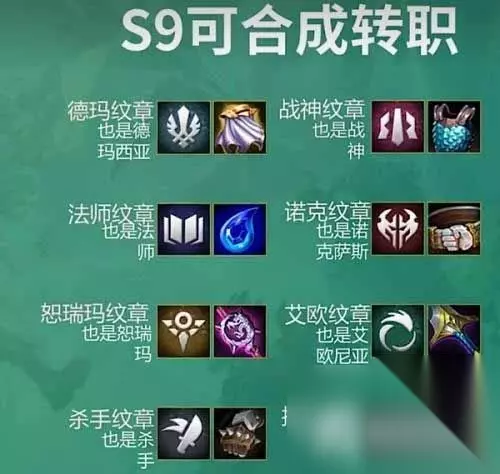 1、艾欧尼亚转职=铲子+大剑; 2、恕瑞玛转职=铲子+大棒; 3、德玛西亚转职=铲子+斗篷; 4、诺克萨斯转职=铲子+腰带; 5、挑战者转职=铲子+攻速; 6、法师转职=铲子+水滴; 7、主宰转职=铲子+锁子甲; 8、裁决战士转职=铲子+拳套; 《云顶之弈》转职合成图s9最新怎么完成,这是一款广大玩家都在玩儿的游戏,融合了多种游戏元素,玩法也是比较多样化,可玩性很足,游戏中需要完成的任务也有很多,相信大家多多少少都会遇到自己不会做的任务,下面就给大家带来详细的攻略教程,一起来看看吧。