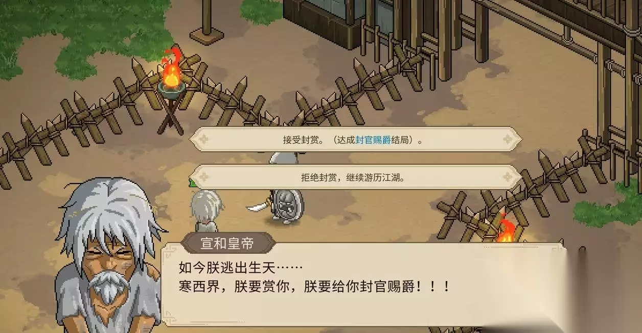 选项1:接受封赏的话,达成“封官赐爵”结局 选项2:拒绝封赏,获得【名声+3000,门派贡献+5000,金箭令牌,娄金狗兽环】,(如果你已经成为了会元,前面保护皇帝出来的时候击杀了4个小头目,这边皇帝会封我们为“文武状元”,名声+800)