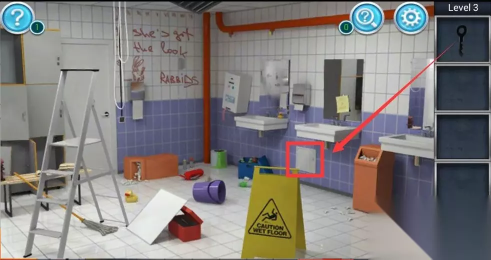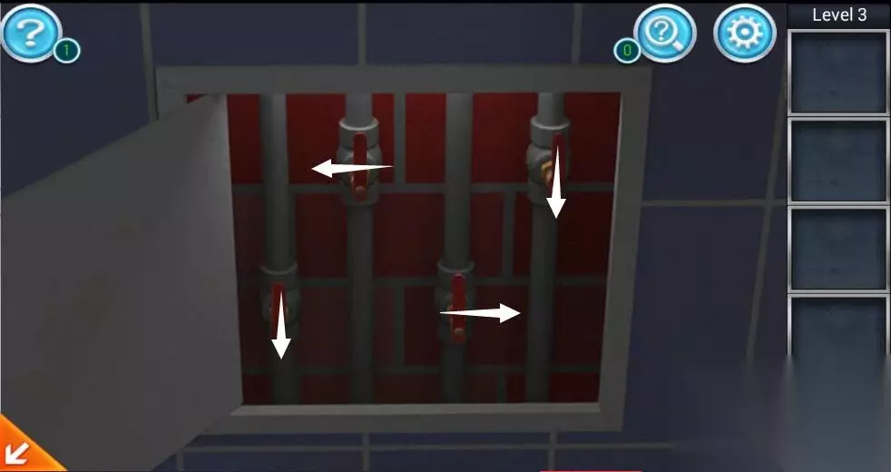 5、之后我们用墙里获得的钥匙打开洗手池下方墙壁上的白色箱子,并根据之前我们从镜子上获得的水蒸气提示箭头调整水池下方闸门的方向。