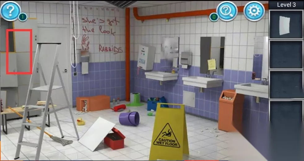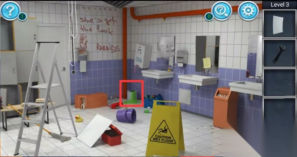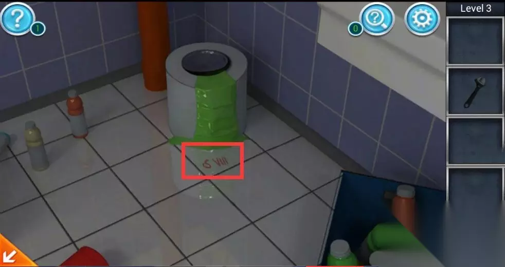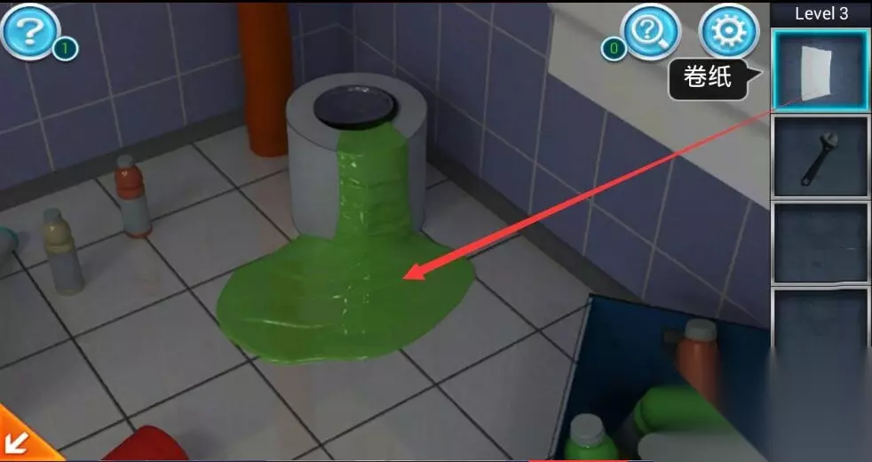 3、接着我们再点击场景角落中绿色油漆的油漆桶,并使用卷纸将地面上漏出的油漆擦干净,就会发现地面砖上隐藏的字母S和数字8。