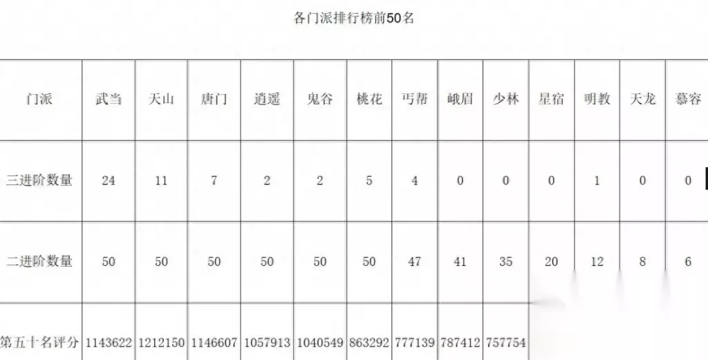 有玩家就统计了当前全服各个门派榜的前50名账号进阶分布,我们可以清晰的看出在三进阶账号当中武当成为大神们最爱的门派(没有之一),紧接着是天山和唐门。武当在进行门派技改之后,其控场、生存能力被大大增强,面对新天外的开放,大神们纷纷转投武当门下,一个三进阶账号的控场和持续输出是及其恐怖的。再来看二进阶账号的分布,这个就比较平均化了,除了慕容、天龙、明教、星宿,其他门派的玩家人数大致相同。