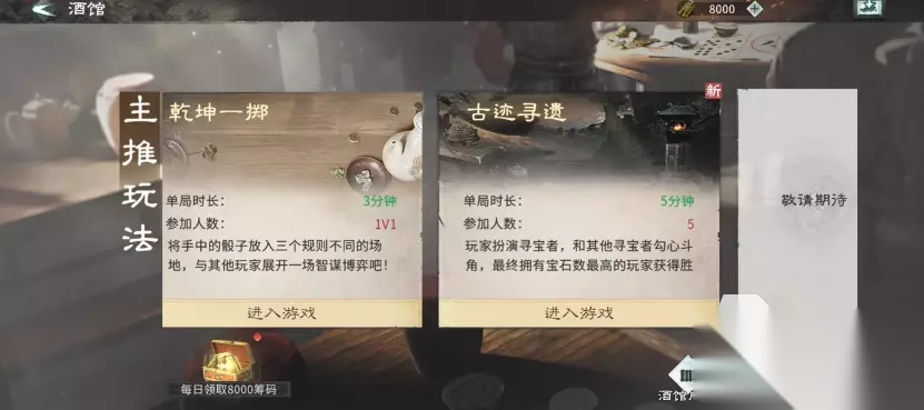 当前酒馆已正式划分为两大独立玩法模块:【乾坤一掷】与【古迹寻遗】。两者均同步更新了最终结算规则,大幅提高单次参与的筹码回报率,使整体资源产出更趋合理、更具可规划性。