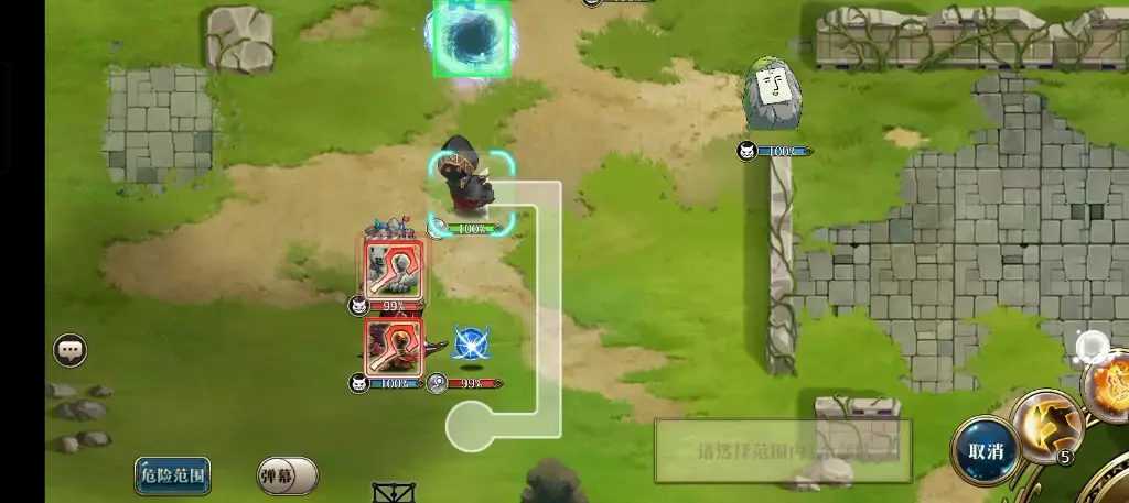这是《梦幻模拟战》门扉彼端5-03平原之章3的解谜攻略,展示了进化之路关卡的通关要点,借助周围水晶升级、击杀或升级可再动的机制,达成1回合胜利、全部击败、生命>50%的全成就。