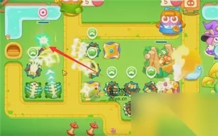 保卫萝卜4绿野奇缘第40关怎么过 1、开局时,在图示位置建造一个满级的多重箭塔,并锁定钱袋子。当前面的小草被打掉后,锁定木头桩子。