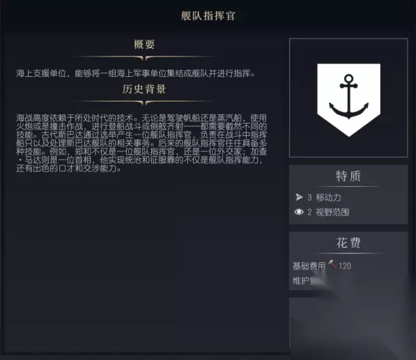 文明7舰队指挥官有什么用 舰队指挥官 概要:海上支援单位,能够将一组海上单位集结成舰队并进行指挥。 特质:3移动力,2视野范围。 花费:基础费用120,维护费用0。 古代斯巴达通过选举产生一位舰队指挥官,负责在战斗中指挥船只以及处理斯巴达舰队的相关事务。后来的舰队指挥官往往具备多种技能。