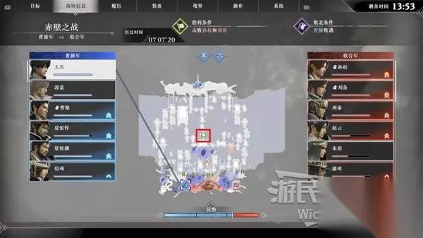 此战开局会将我们刷在地图右侧,先上岸击败周围的敌军,注意左边武将们说的话。 看到郭嘉说的【敌军一直都在防守】后,说明我们触发了IF条件的第一步。