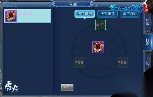 不同于倩女端游,手游中的纹饰将镶嵌在法宝上。蓝色及以上的法宝可以用金刚钻打孔,用以镶嵌各类纹饰。同时每个法宝只能镶嵌一种同名纹饰,而且抵当值可以与现有的抗性叠加,抵当值达到一定的效果还可触发特殊效果。但每个法宝只能镶嵌一种同名纹饰。