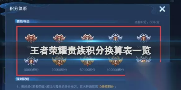 2、积分换算规则: 1积分=1点券=0.1元人民币。 请注意,仅充值但未使用的点券不会增加贵族积分,也不会提升贵族等级。贵族身份只在当前大区内生效,每个月内在当前大区消费任意金额的点券即可维持贵族等级。如果自然月内在当前大区没有消费点券,跨月后贵族等级将下降1级,直到降到2级,即失去贵族身份。 以上就是小编为大家带来的王者荣耀贵族积分换算表一览的全部内容了,希望对大家有所帮助,更多内容可以关注233乐园。 【小编推荐】专区入口 || 视频站入口 || 体验服申请入口 || 全民竞猜赢好礼 【新英雄爆料】| 司马懿 || 瑶 || 孙策 || 新英雄:囚徒/书圣/瞬 | 【新皮肤爆料】| 李白团战皮肤:敏锐之力new || 诸葛亮团战皮肤:掌控 || 典韦穷奇皮肤 Hot!! | 王者荣耀最新攻略 赛季段位继承表 每日一题 边境突围玩法攻略 体验服爆料