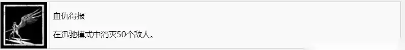 血仇得报 在迅驰模式中消灭50个敌人。 你可以理解为奎爷的斯巴达之怒,这个模式干掉50个敌人,记住要普攻,技能打死的不算。
