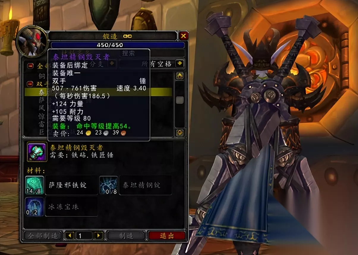 另外,锻造还可以制造额外的物品来获取收益,例如附魔专业必需的附魔棒,泰坦神铁棒是最新的附魔棒,仅需两个萨隆邪铁锭和一个泰坦神铁锭即可制作,在版本初期需求量肯定巨大。