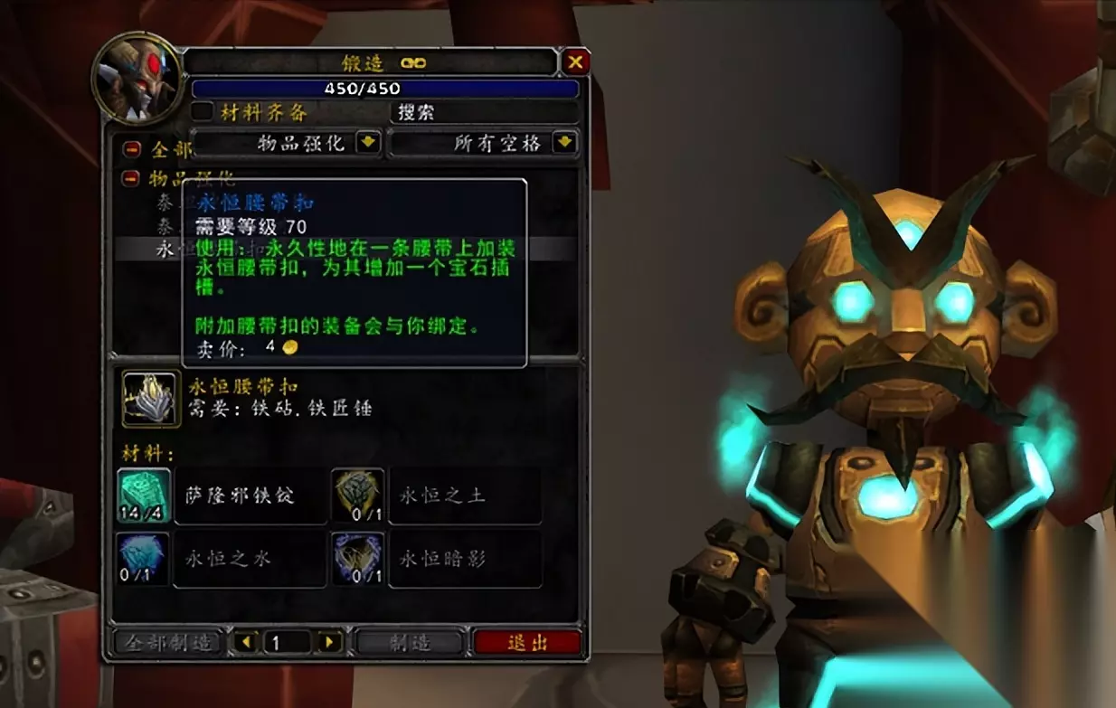 最后,锻造专业还新增了许多物品强化消耗品,泰坦神铁武器链可以为武器附魔,提供命中属性,还能使被缴械效果的持续时间减少50%,在PVP场景下还是有一定用处的,锻造还能制作一个实用的蓝色物品——永恒腰带扣,可以永久性为一件腰带装备增加一个宝石插槽,并且该物品可以在拍卖行出售,当年不少玩家甚至到版本末期才知道这个物品的存在,不过,如今怀旧服玩家对属性提升非常苛刻,该物品在80级必定会变得非常抢手。
