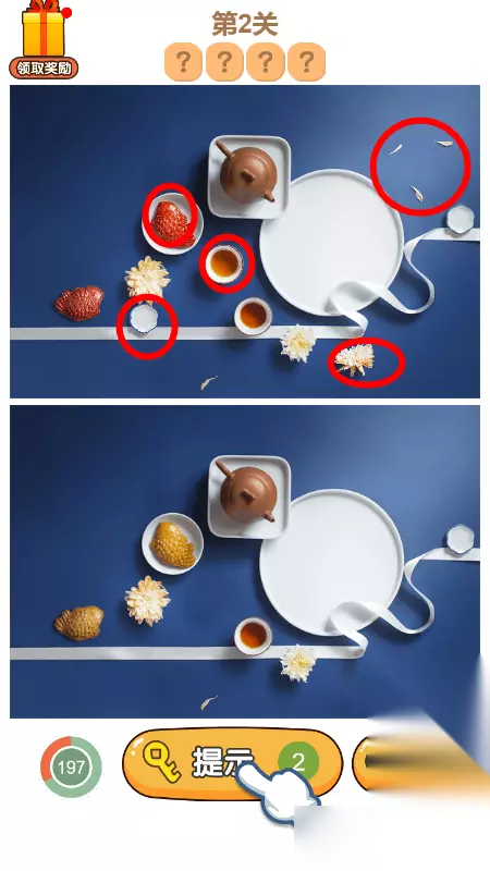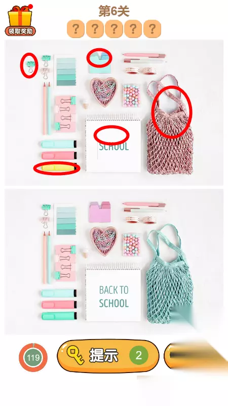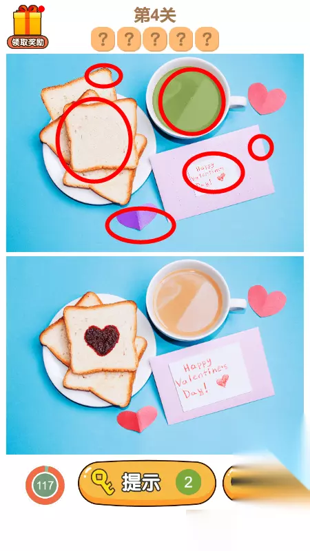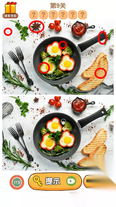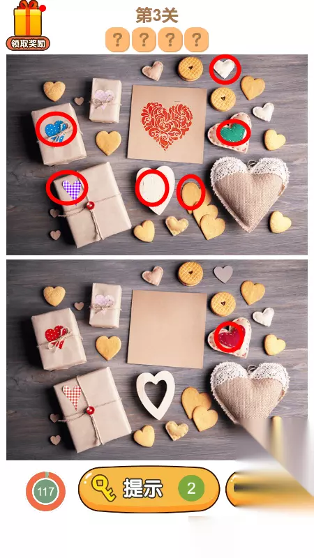 3.第三关答案总共有7处不同,如下图所示,圈出5个就能够过关,还有一个红色的大花,没有圈出来