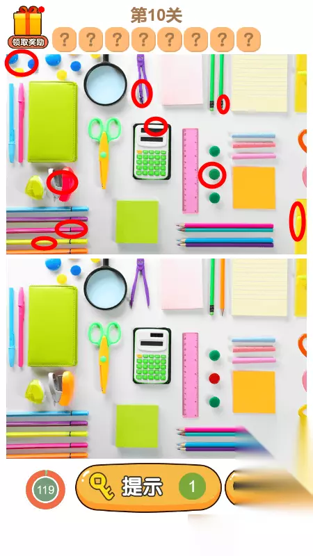 10.第十关答案,找不8处不同的地方,小编找出了9个哦,如下图所示