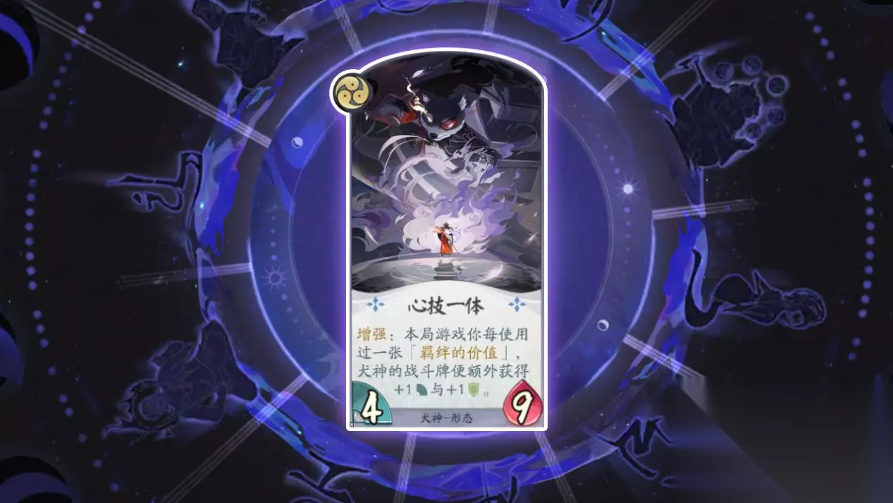 卡牌名称:心技一体 卡牌等级:三级(形态牌) 卡牌效果:本局中每使用一张“羁绊的价值”,犬神的战斗牌会额外获得+1力量+1护甲 卡牌作用:用来提升犬神战斗牌的强度,让他的战斗牌获得更高的力量和生命值,为牌手在对局中创建优势。