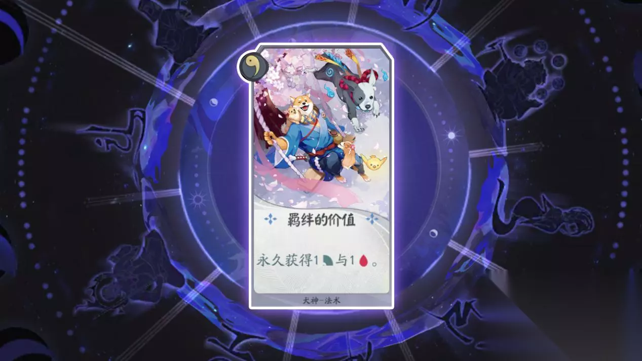 卡牌名称:羁绊的价值 卡牌等级:一级(法术牌) 卡牌效果:永久获得+1力量+1生命, 卡牌作用:犬神的核心卡牌,前期可以让式神获得较高的力量和生命。前期修行顺利的犬神能够与其他式神拉开差距,从而占据有利地位。