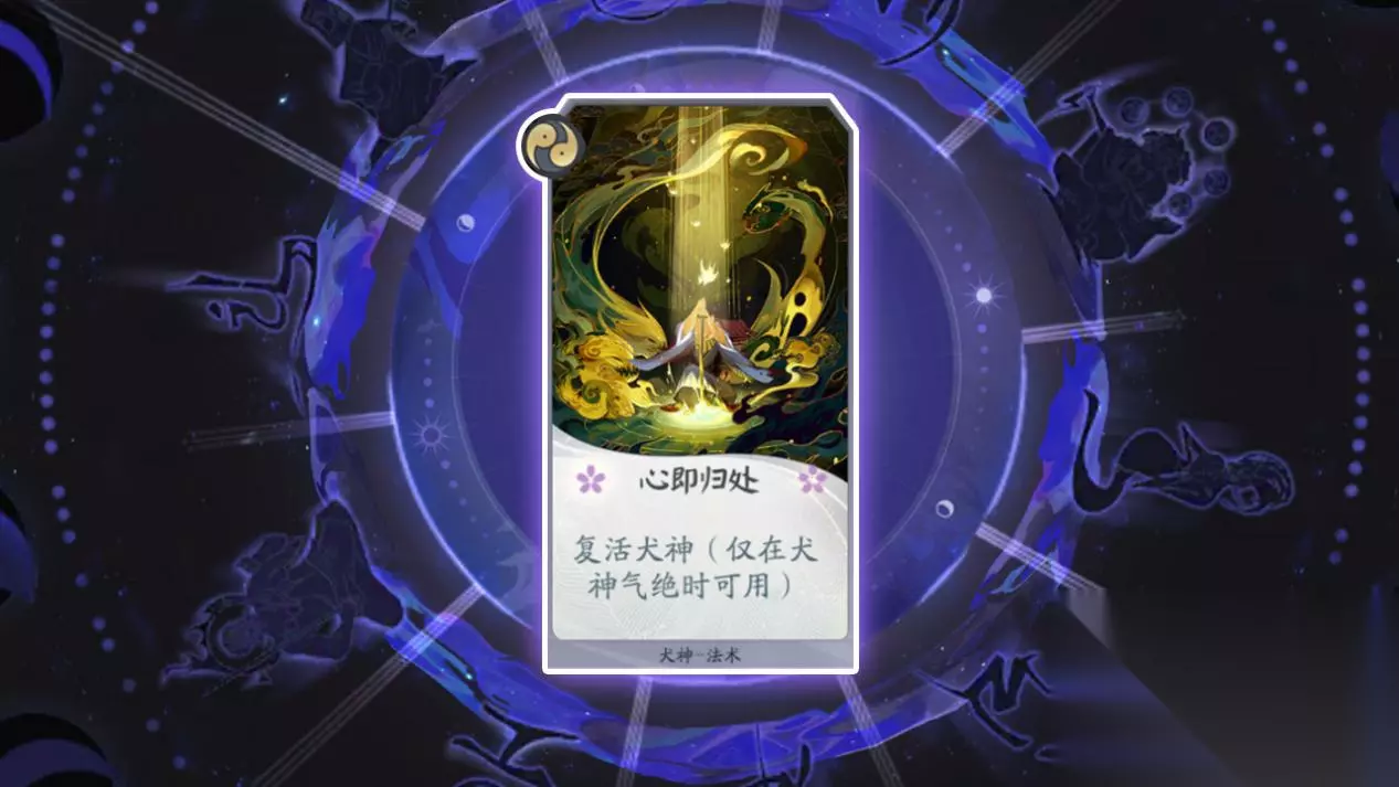 卡牌名称:心即归处 卡牌等级:二级(法术牌) 卡牌效果:可以在犬神气绝时复活犬神。 卡牌作用:能够复活犬神。在中期可以使犬神成为一个非常的难缠的式神。