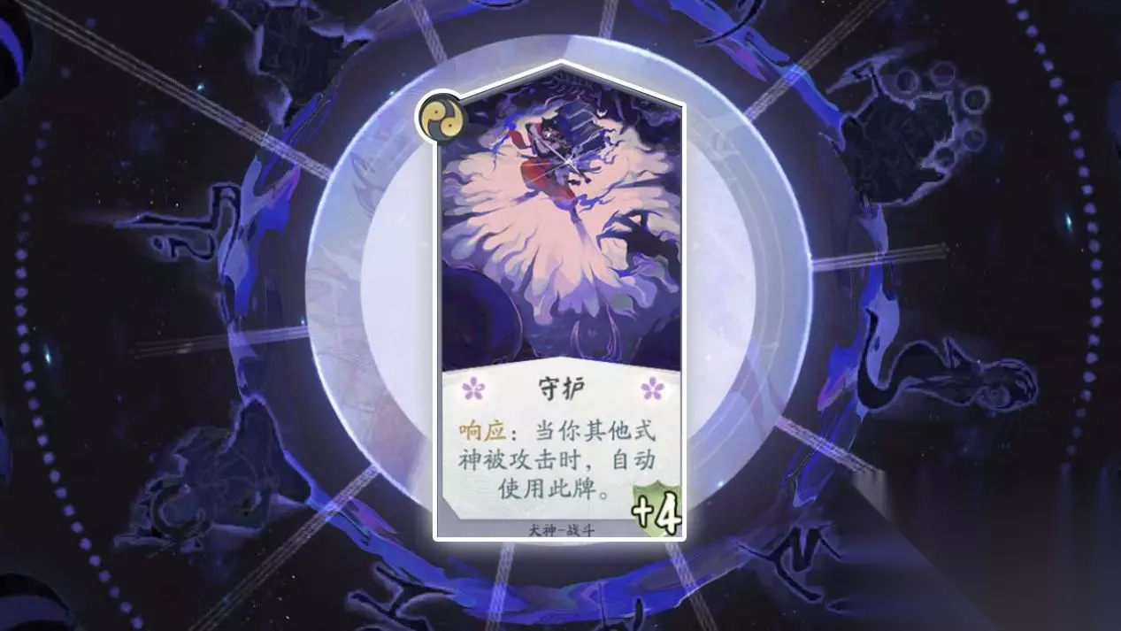 卡牌名称:守护 卡牌等级:二级(战斗牌) 卡牌效果:+4护甲当你其他式神被攻击时,自动使用此牌。 卡牌作用:可以在己方其他式神受攻击时,利用此卡牌自动出击一次,打对手一个措手不及。前提是要留一点鬼火,没有鬼火,响应牌无法触发。