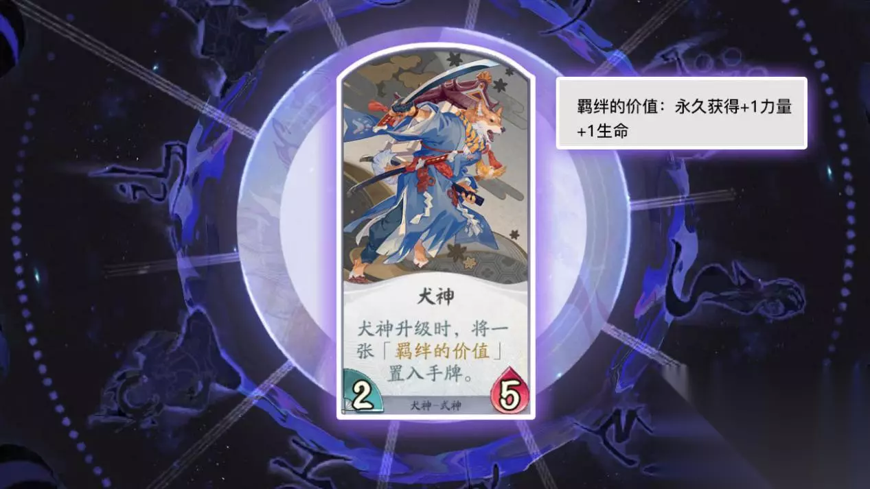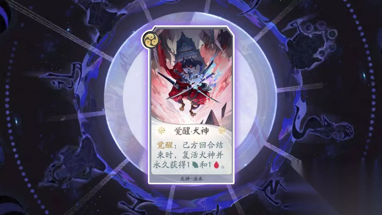 卡牌名称:觉醒.犬神 卡牌等级:三级 卡牌效果:己方回合结束时,复活犬神并永久获得1力量和1生命(法术牌) 卡牌作用:觉醒后的犬神可以在己方回合结束时复活,加强了犬神的成长能力和承伤能力。