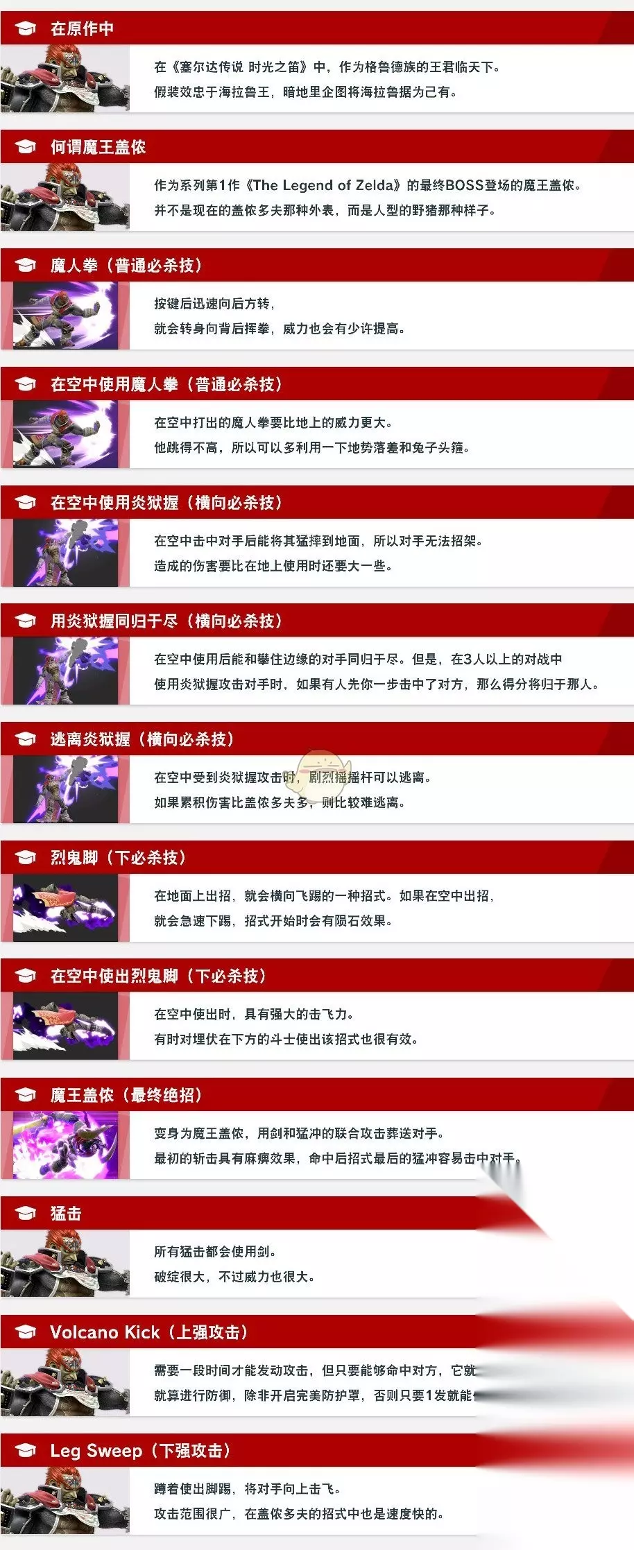 盖侬多夫是塞尔达传说1代的最终BOSS,本次也参加了《任天堂明星大乱斗特别版》,他拥有强大的正面作战能力,并且可以变身成魔王盖侬,下边就给大家带来任天堂明星大乱斗特别版盖侬多夫技能招式一览。 任天堂明星大乱斗特别版盖侬多夫技能招式一览