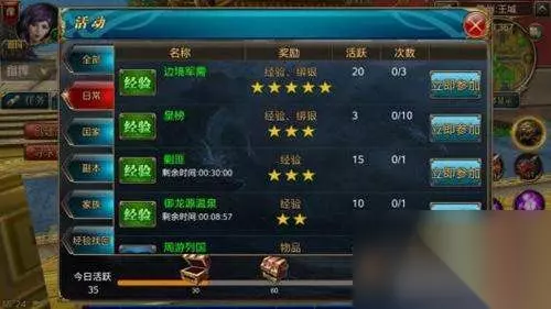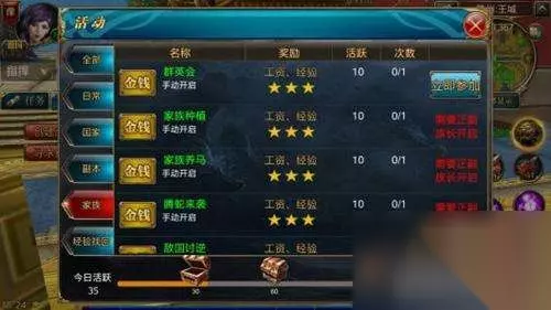 4.家族任务 首先要加入一个家族,之前在讲家族系统的时候已经说过了。家族里每天有很多活动,家族任务清完就会有大量的经验。值得一说的是家族的组长会组织大家在某个时间段在家族庄园喝酒,越多人一起喝酒,得到的经验就越多。