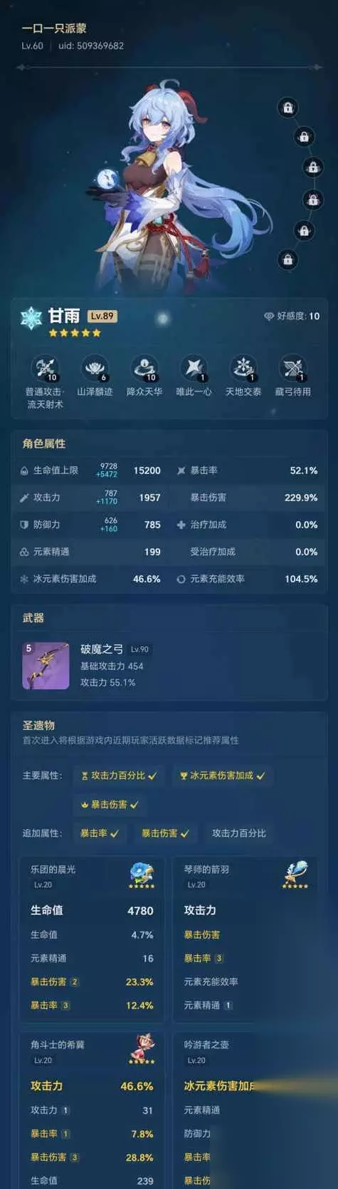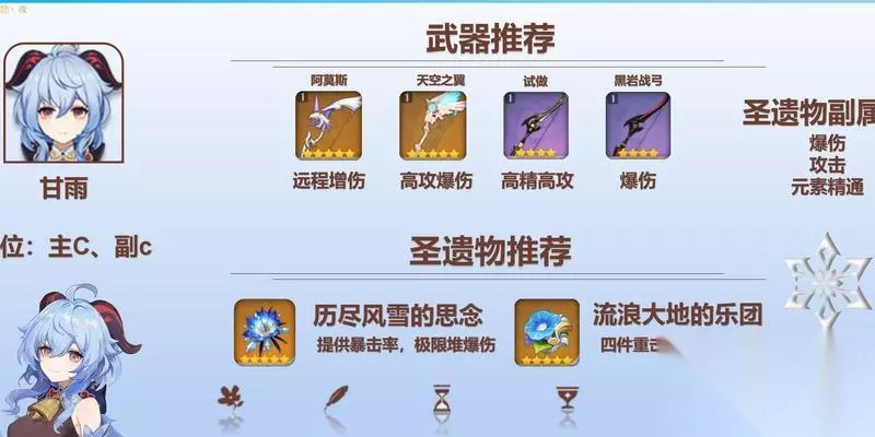 甘雨的属性分析 甘雨是一名水系法师,其属性中以元素精通、暴击率和攻击为主要加点。由于甘雨大招需要消耗元素能量,所以合理搭配的圣遗物可以让其更快地积攒元素能量,并提升输出。 武器选择分析 1.龙脊之刺 龙脊之刺是一把四星长枪,主要加点为元素精通和攻击力。其特性为在普通攻击和重击后有一定几率触发飞翔,增加一次攻击。对于甘雨的输出有很好的提升作用。 2.天空之翼 天空之翼是一把五星长弓,主要加点为攻击力和暴击率。其特性为普通攻击和瞄准射击时有几率触发火力全开,提升攻击速度和伤害。对于甘雨的输出能力有明显的提升。