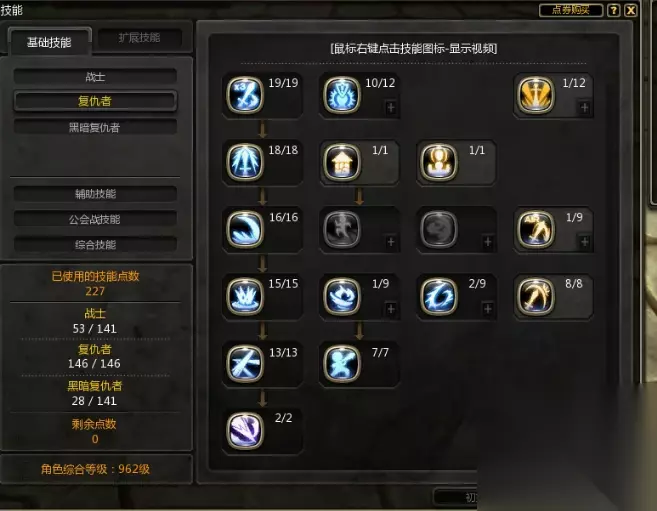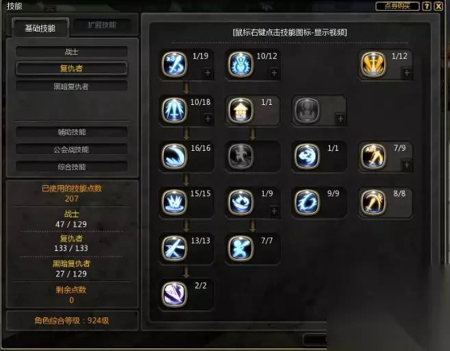 2、复仇者技能页面: 主要注意复仇冲击和火焰连击,这两个技能任选一个加满点或者两个都可以加满点根据个人爱好的技能,考虑到复仇者是火攻职业,但是表现出的物攻属性较强,所以被动技能尽量点满,如图