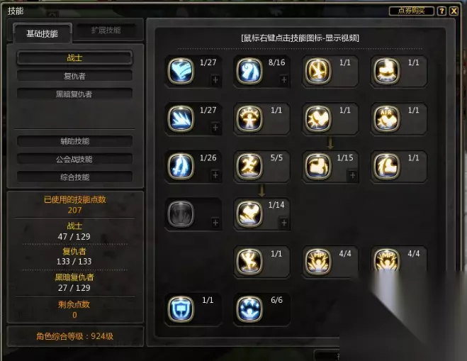 3、黑暗复仇者技能页面: 技能点主要考虑自己想不想堆最终属性,如果你是平民玩家,就不必要考虑了,如图加点,否则EX加强技能点前面的就好了