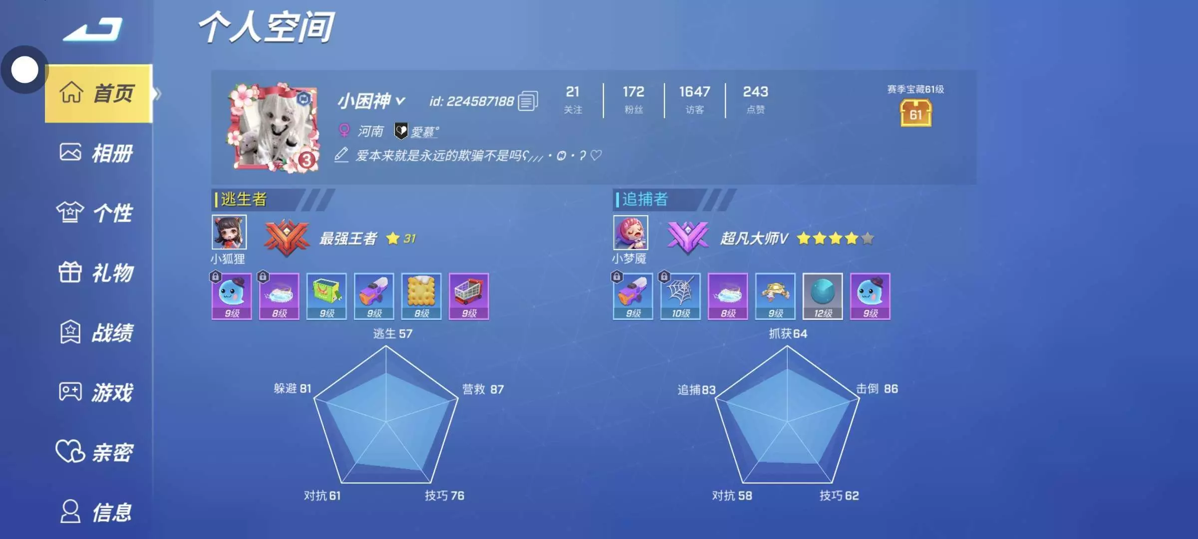 #种草吧玩家 在《逃跑吧少年》的世界里,你可以化身最强王者逃生者,用智慧与操作在危机中极限逃生、营救队友;也能成为超凡大师追捕者,凭借策略与技巧将对手一一抓获!这里有丰富的角色技能、多样的道具搭配,还有充满竞技感的段位系统。无论是喜欢团队协作的逃生玩法,还是偏爱单兵作战的追捕模式,都能找到属于你的乐趣。快加入这场刺激的追逃对决,在个人空间展示你的高光战绩,和百万玩家一起开启欢乐又紧张的游戏之旅!