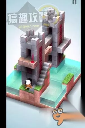 翻转视角,将顶部的机关降下来,人物站在机关上,即可到达顶部的终点了。