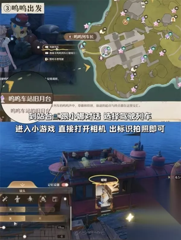 三、呜呜出发 1、传送至【呜呜列车旧月台】 2、抵达后将视角转向后方。 3、与小娜对话,选择“驾驶列车”。 4、进入小游戏后打开相机,出现拍照标识时拍摄。