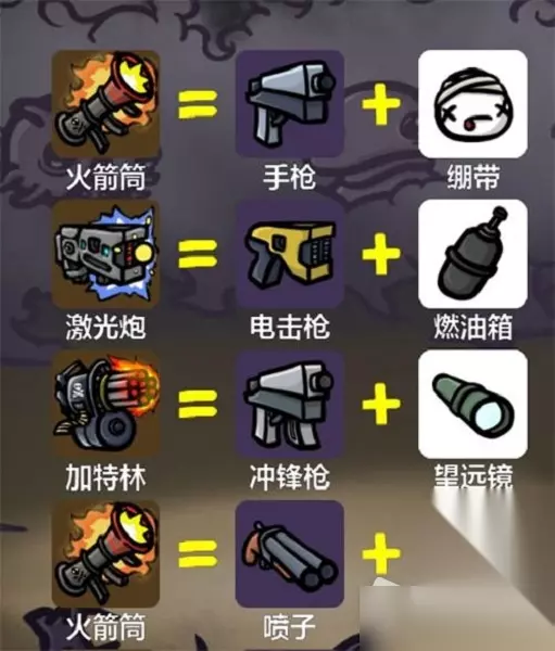 4、电锯=巨石+催化剂 5、火箭筒=手枪+绷带 6、激光炮=电击枪+燃油箱 7、加特林=沖锋枪+望远镜